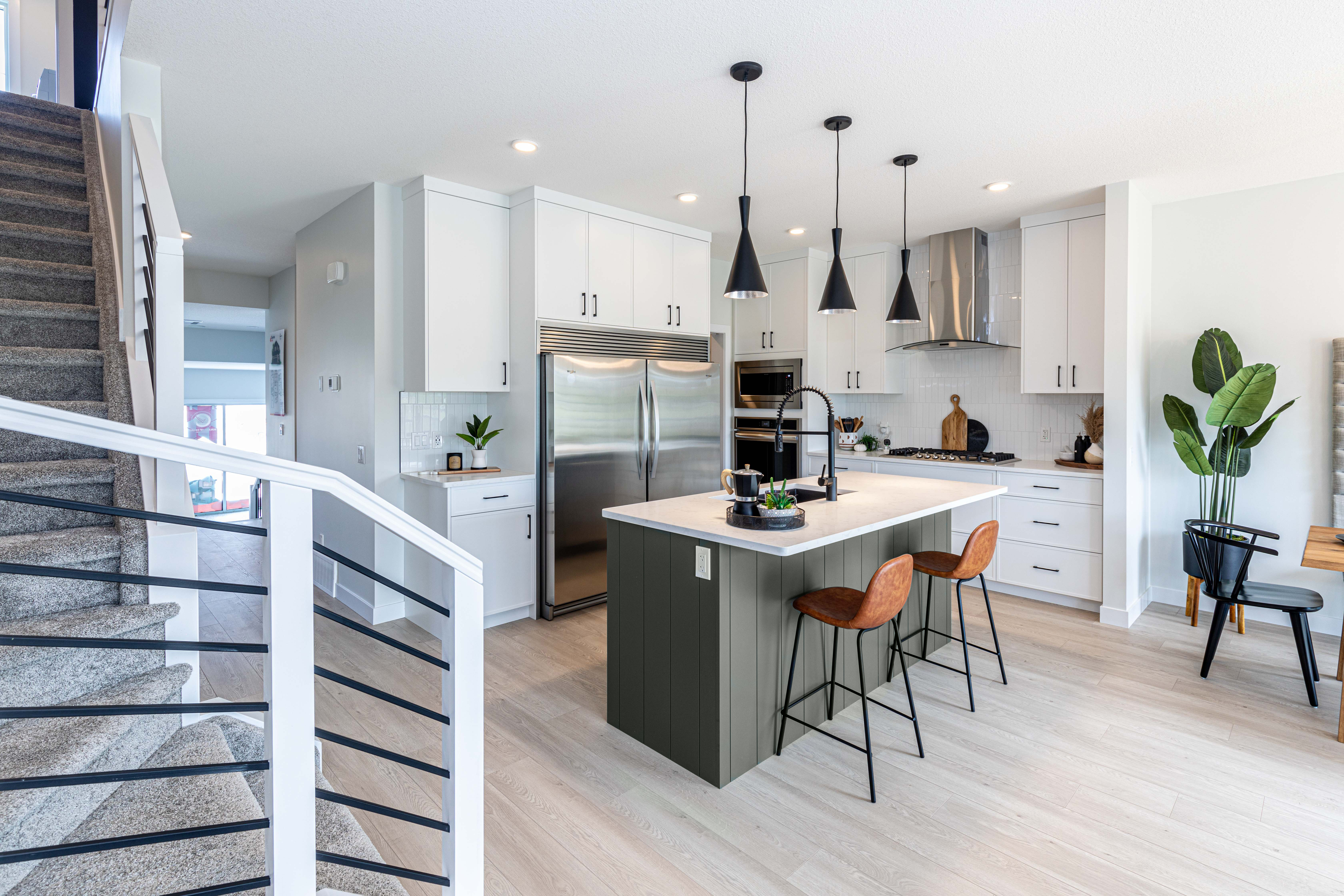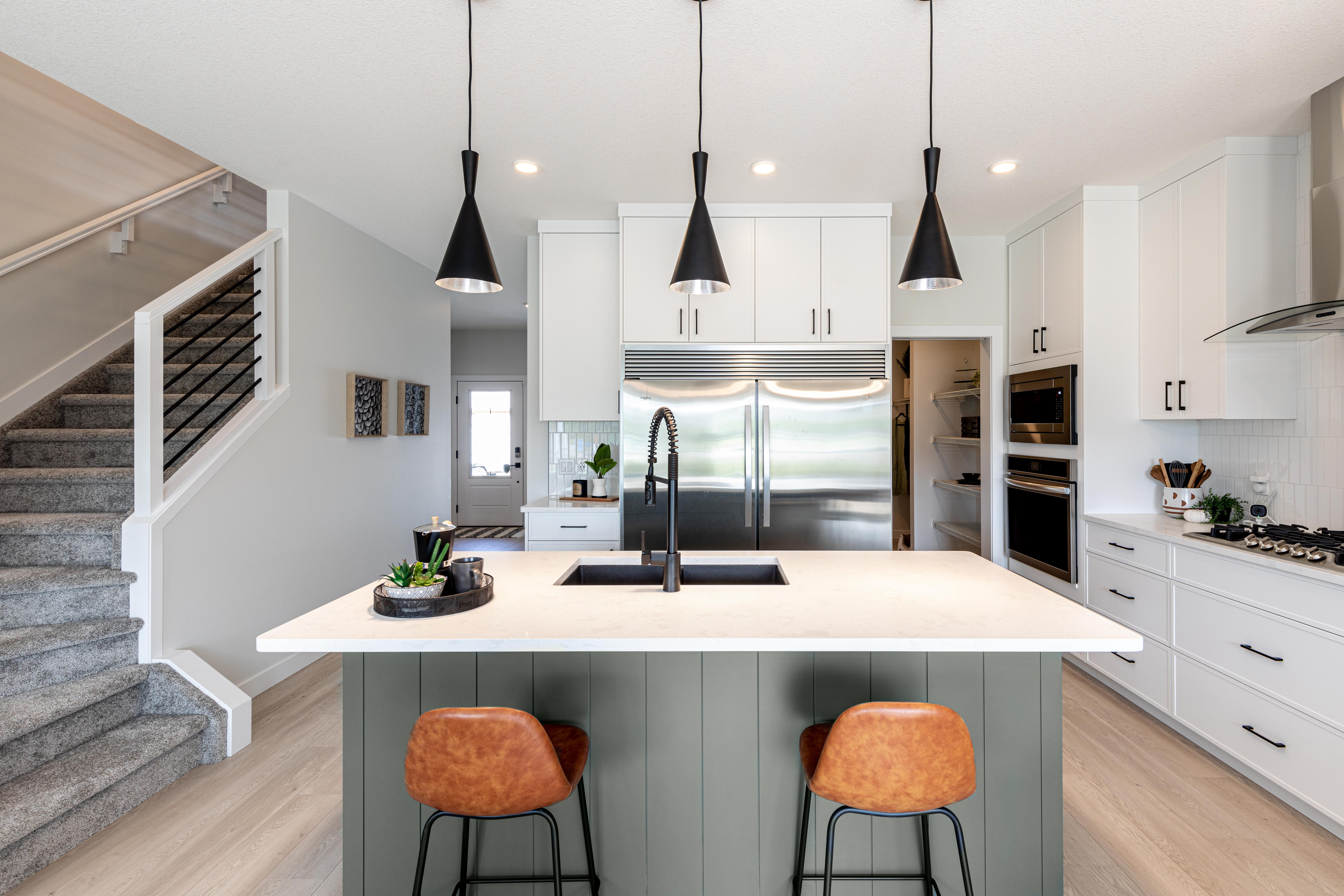 The Macan has a total living space of 1,872 sq.ft., with 3 bedrooms, 2.5 baths and a cozy bonus room retreat. Walking through the foyer to the kitchen there is an option to add a glass wall to the staircase to open the space as an added feature. This exclusive model includes executive chef’s appliances including a gas range, and double wide fridge. The view from the kitchen island is the living space with great room and nook at the back of the home. Enjoy the convenience of a walk-through pantry that leads to the mudroom and double car, attached garage. Up the stairs is the bonus room with the laundry room, including linen storage close by. There are 2 bedrooms as well as a master bedroom retreat complete with a walk in closet with a window for additional light and an ensuite that includes double sinks. Create more living space by developing the optional basement.