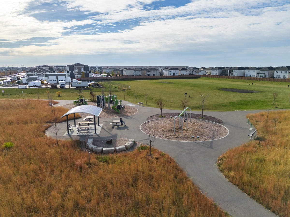 Prairie Pointe is a nature-focused community where thoughtfully designed green spaces, native prairie landscaping, and scenic ponds come together to create a calm, connected setting. A wetland-inspired drainage system with creeks and waterways adds both environmental care and natural beauty throughout the neighbourhood.